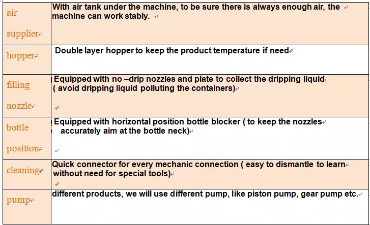 Ushbu mashina motor moyi, motor moyi, salat, qo'l yuvish jeli, hindiston yong'og'i yog'i, soya sousi, sesame, shampun, suyuq sovun, dvigatel yog'i kabi oziq-ovqat sanoatida, kimyo sanoatida va tovarda har qanday yopishqoqlik / suyuqlik uchun maxsus ishlab chiqarilgan. , tormoz yog'i, pishirish yog'i, pomidor sousi, ichimlik, efir moyi, o'simlik moyi, asal, qalampir sousi, yerfıstığı yog'i, yogurt, sharbat, ichimlik va boshqalar. Suyuqlik / sous bilan bog'langanlarning barchasi yuqori sifatli zanglamaydigan po'latdir. Mashina to'ldirish uchun piston pompasini qabul qiladi. Pompa o'rnini sozlash bilan, u barcha idishlarni tez to'ldirish va aniqlik bilan bitta to'lg'azish mashinasiga to'ldirishi mumkin.